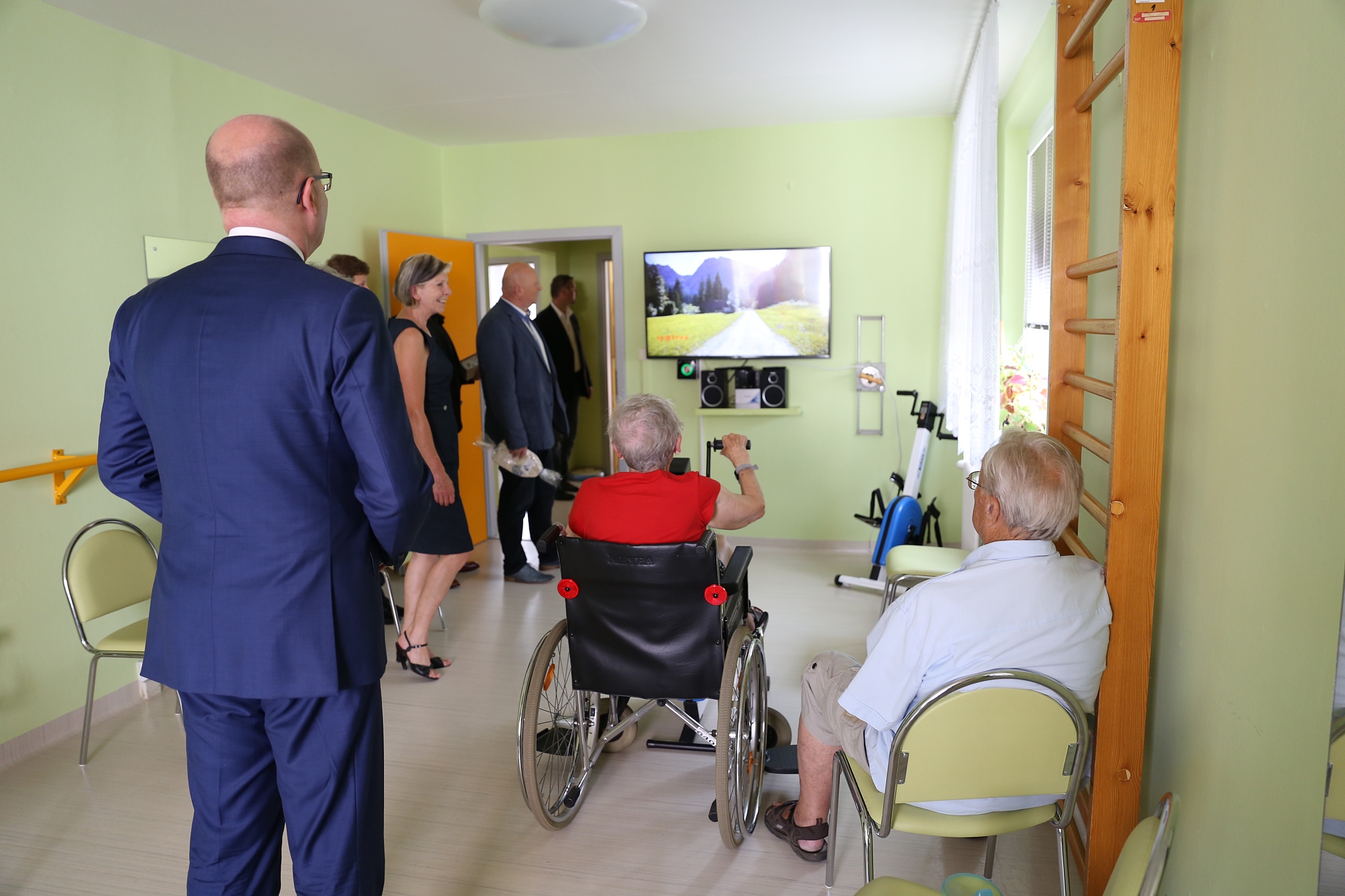 Po přivítání v kanceláři paní ředitelky se celá delegace vydala do jednotlivých pater domova. Všechny zaujala chodba s prvky pro trénování paměti na zeleném úseku. Po prohlídce domova a zahrad jsme se všichni sešli v jídelně, kde měli zaměstnanci prostor diskutovat a ptát se na otázky týkající se sociální oblasti. Atmosféra byla uvolněná, pan Sobotka, pan Holan a paní ředitelka nám poděkovali za kvalitní a potřebnou práci, kterou vykonáváme pro dobro druhých. Snad se jim u nás líbilo a nepřijeli naposledy.