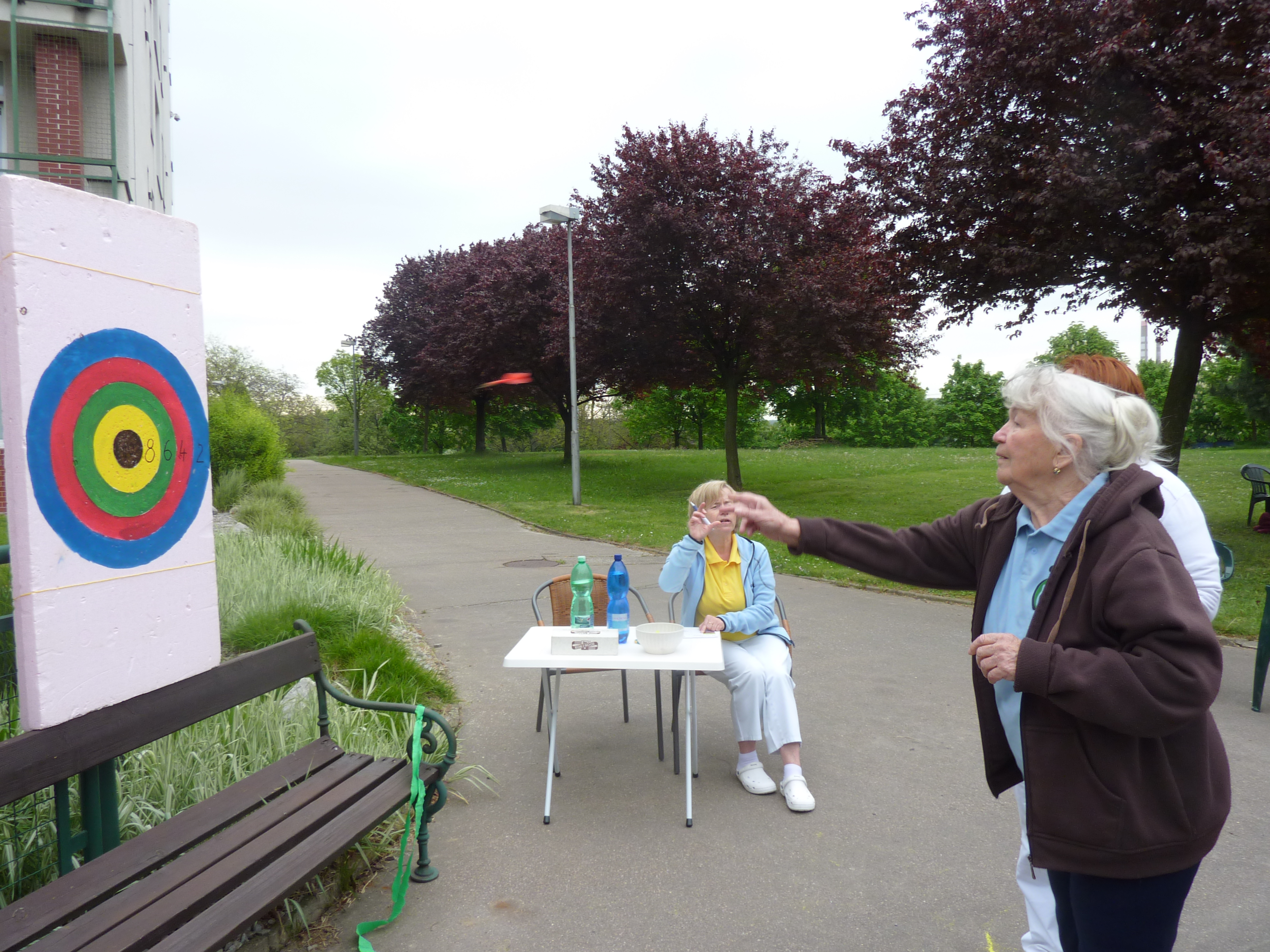 Soutěžily jsme v pěti disciplínách – hodu šipkami, hodu petanqueovou koulí, hodu míčem na koš, cyklistice na rotopedu a maratonu okolo zahrady. Tyto disciplíny se nám velice líbily a úspěšně jsme se jimi probojovaly.