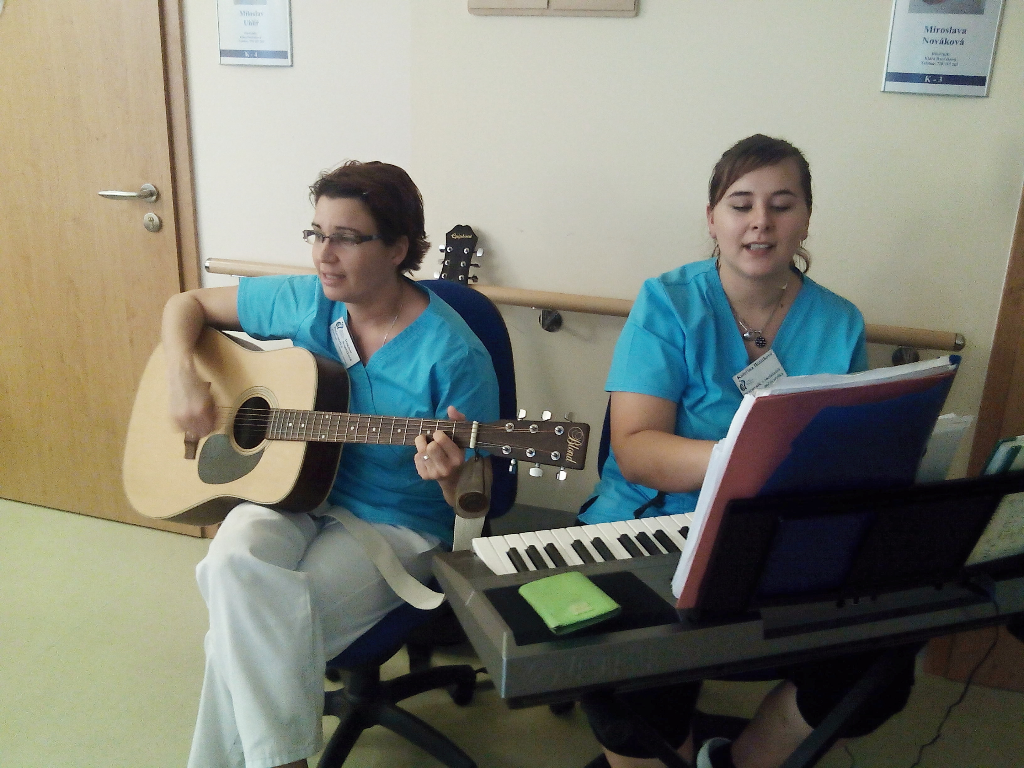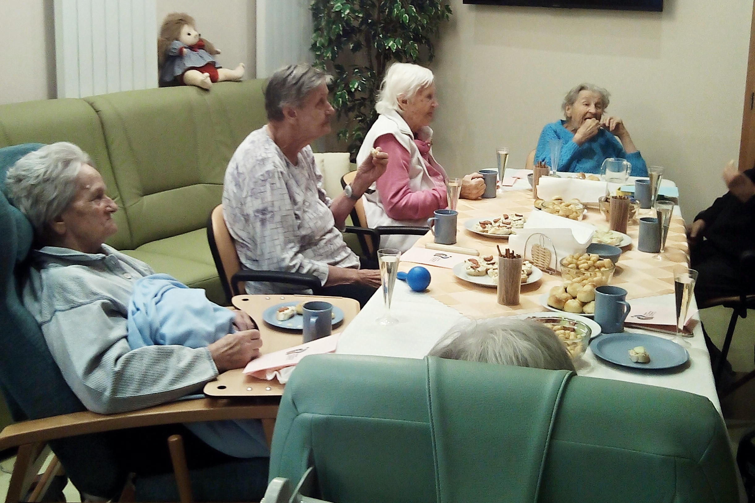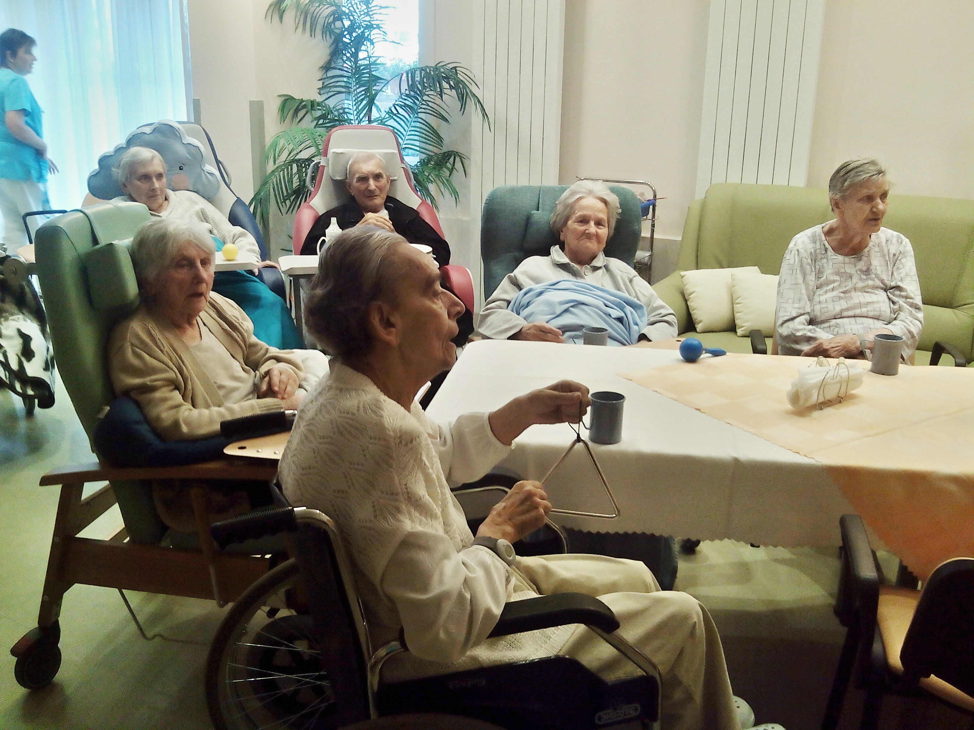 Společně jsme poseděli u dobrého jídla a veselé písničky. Samotní klienti byli chvílemi aktivně zapojeni hrou na orffovy nástroje. Každý z klientů dostal od paní ředitelky přáníčko, ať se všem klientům na tomto oddělení i nadále dobře žije. Vzácným hostem byl náš klient, pan Klečka, který zahrál na akordeon. I s paní ředitelkou jsme zazpívali jeho autorskou píseň "Naše pěsnička".